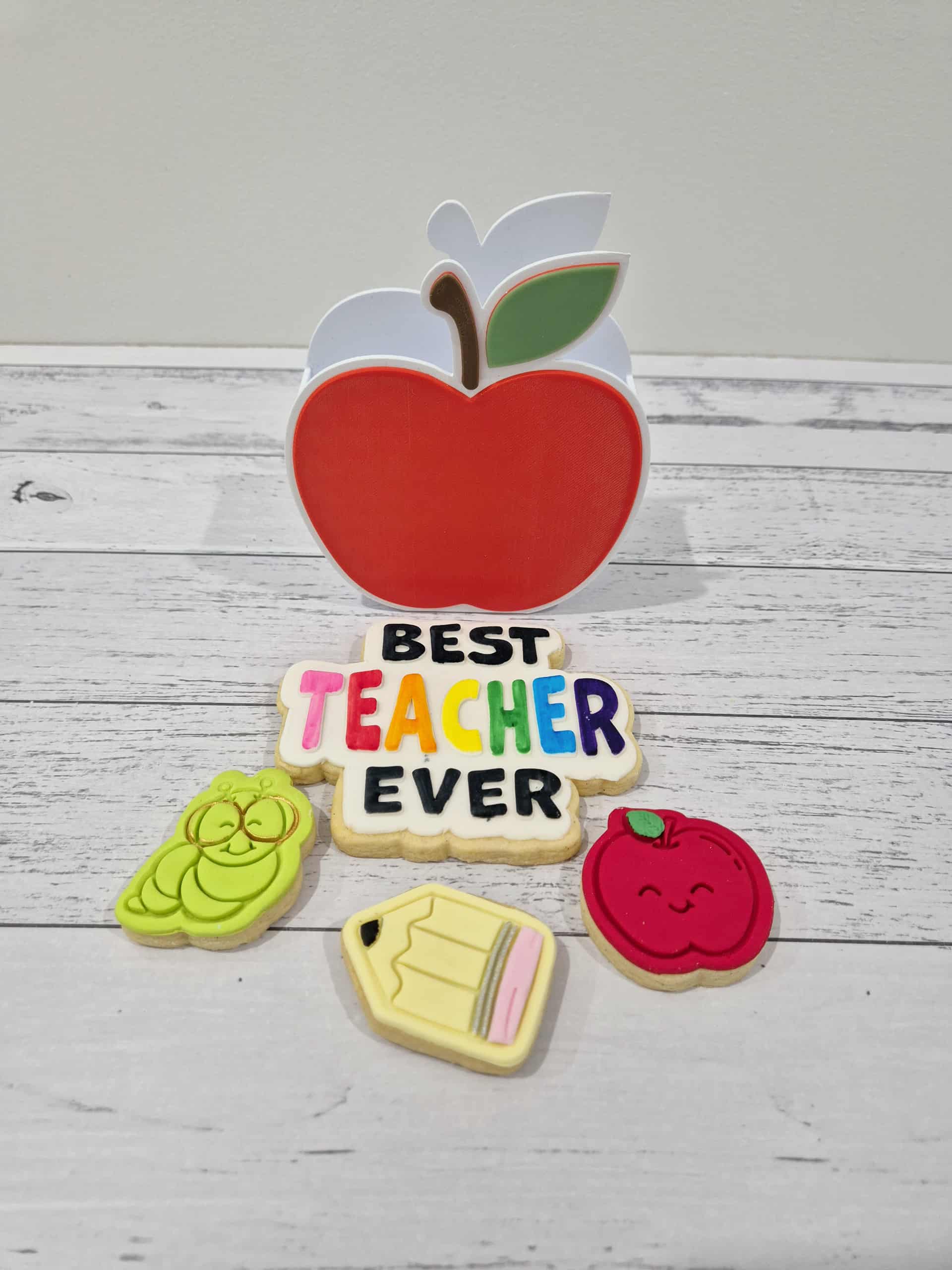 Each set includes a 3D printed pen holder and delicious cookies placed inside